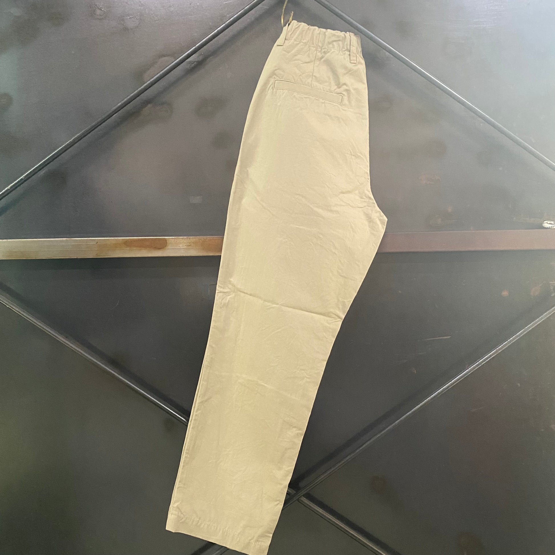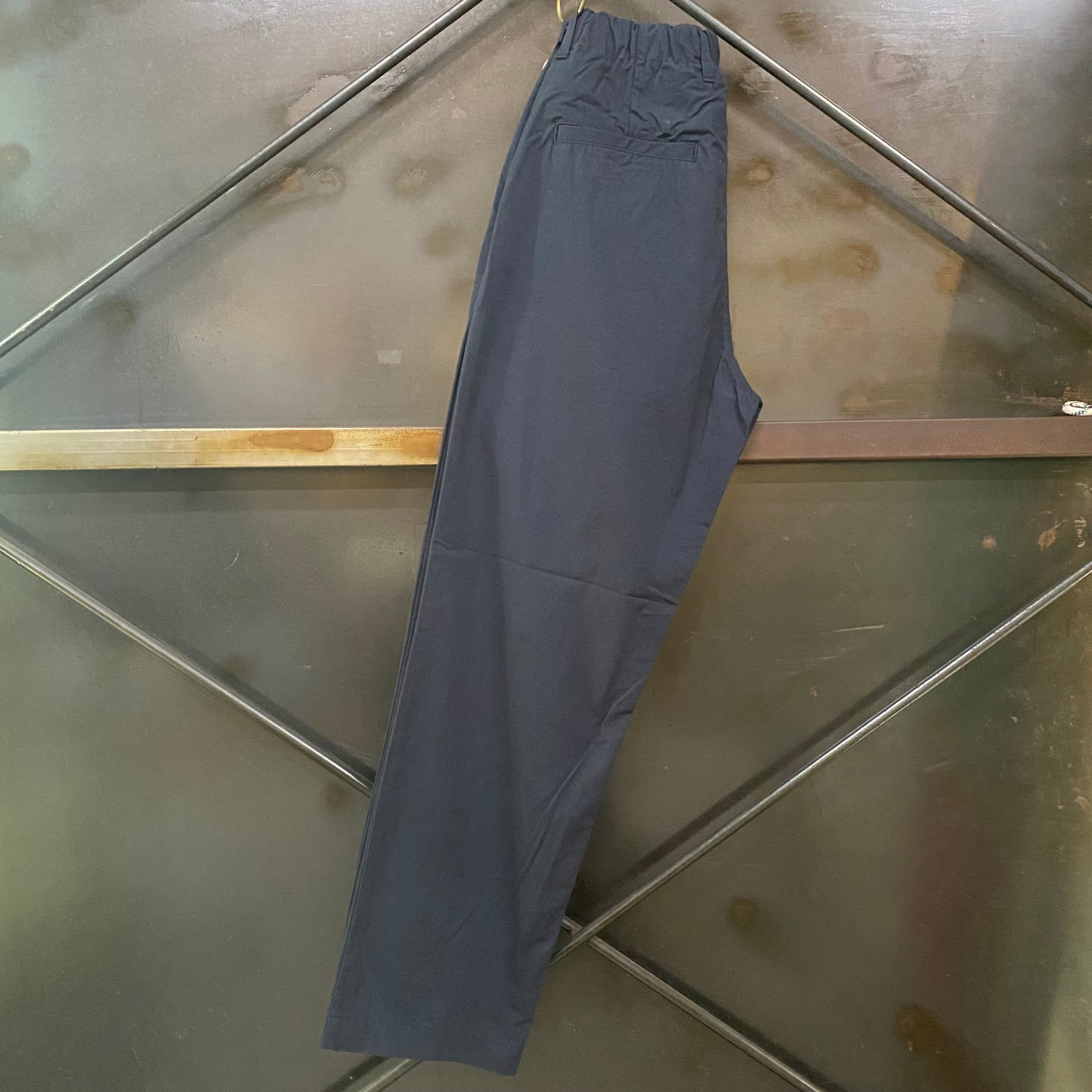 ウエストにフィット感を高める様に、ゴムを配し少しヒップにゆとりを持たせ、スッキリした股上に仕上げられた、ドライタッチでソフトな風合いが特徴です。