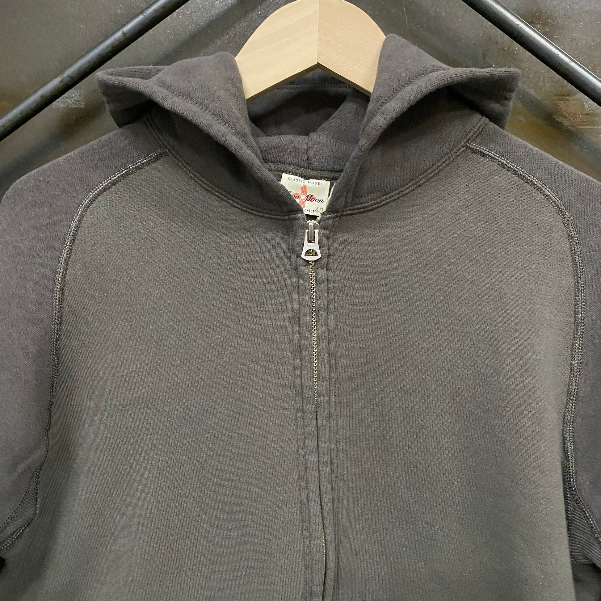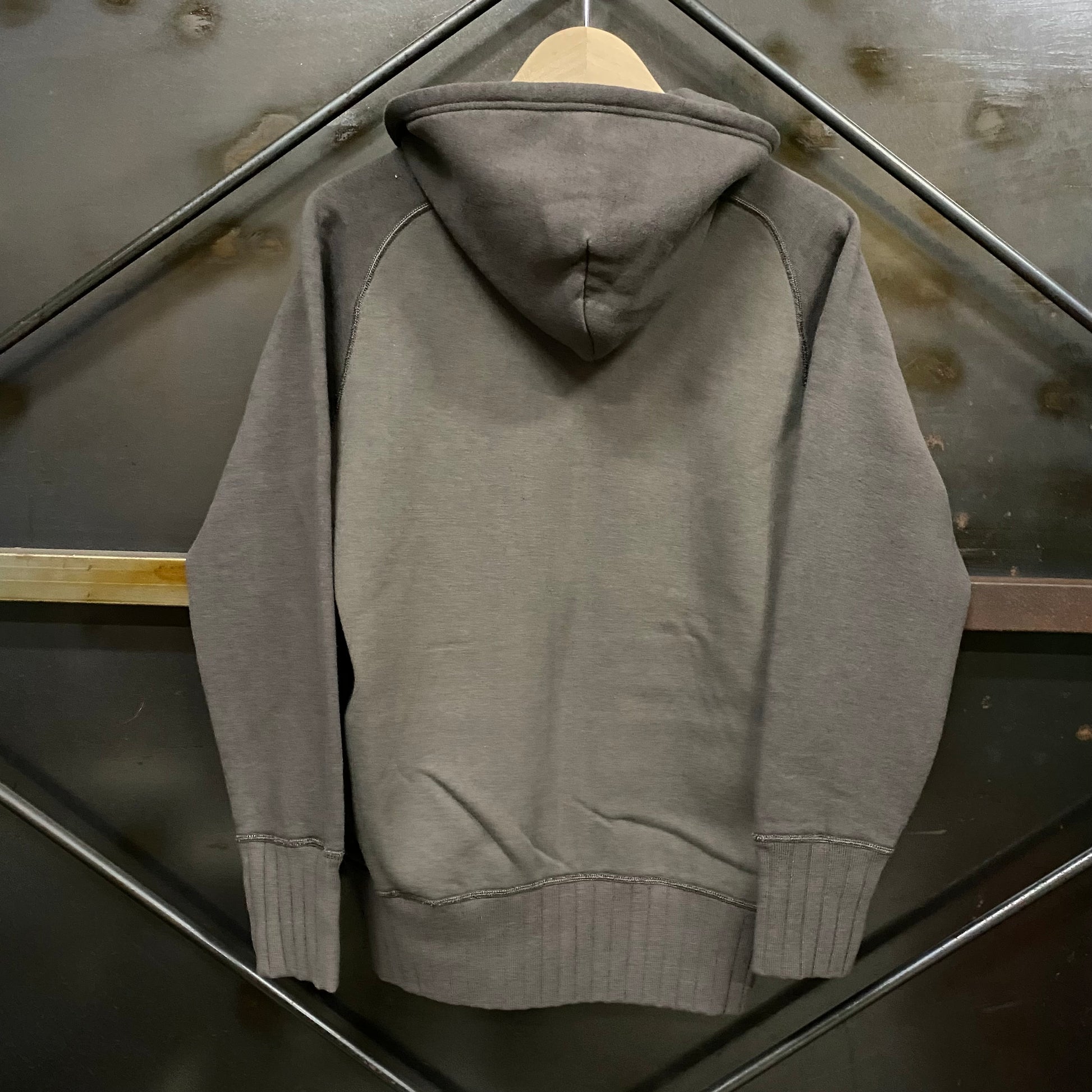肉厚な吊り裏毛(丸胴)を使用したフルジップパーカー。 古い吊り編み機でゆっくりと編み裏起毛をかけた、伸縮性のある柔らかいスウェット素材。 、ジッパーを付けた贅沢な作り