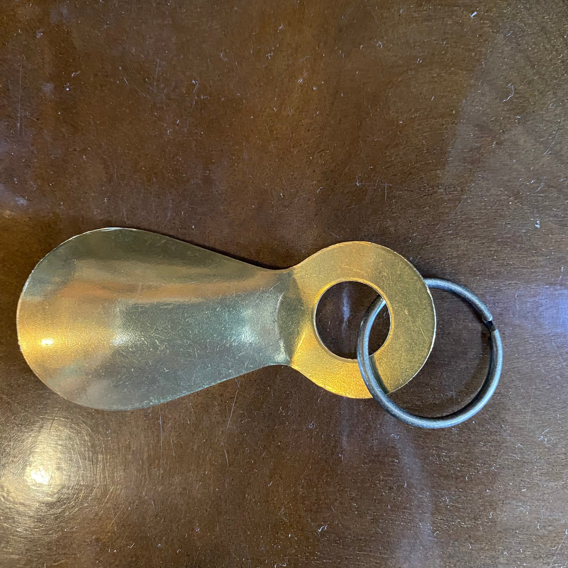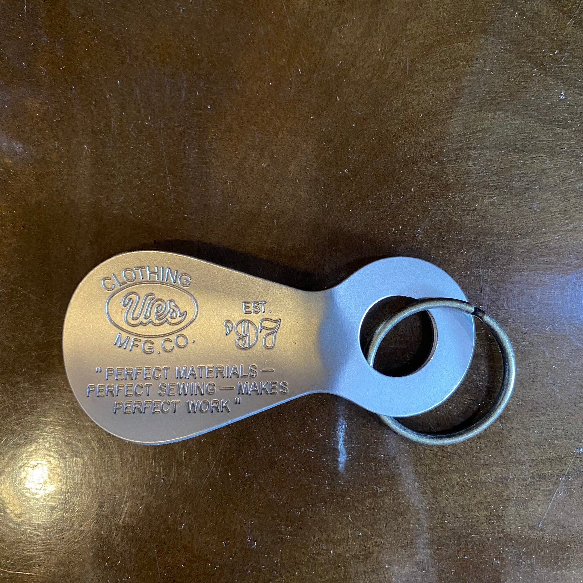 真鍮そのままの素材を活かして作った靴べら型キーホルダーです。UESのロゴと、モノ作りに対する想いが刻まれています。キーホルダーですので簡単に携行でき、自分が靴を履く時だけでなく、周りの誰かが必要としている時にさり気なく差し出してあげるのにも便利です。素材が真鍮ですので使っていくうちにアジのある経年変化が楽しめます。大人の小道具としてぜひ身に付けてみませんか?
